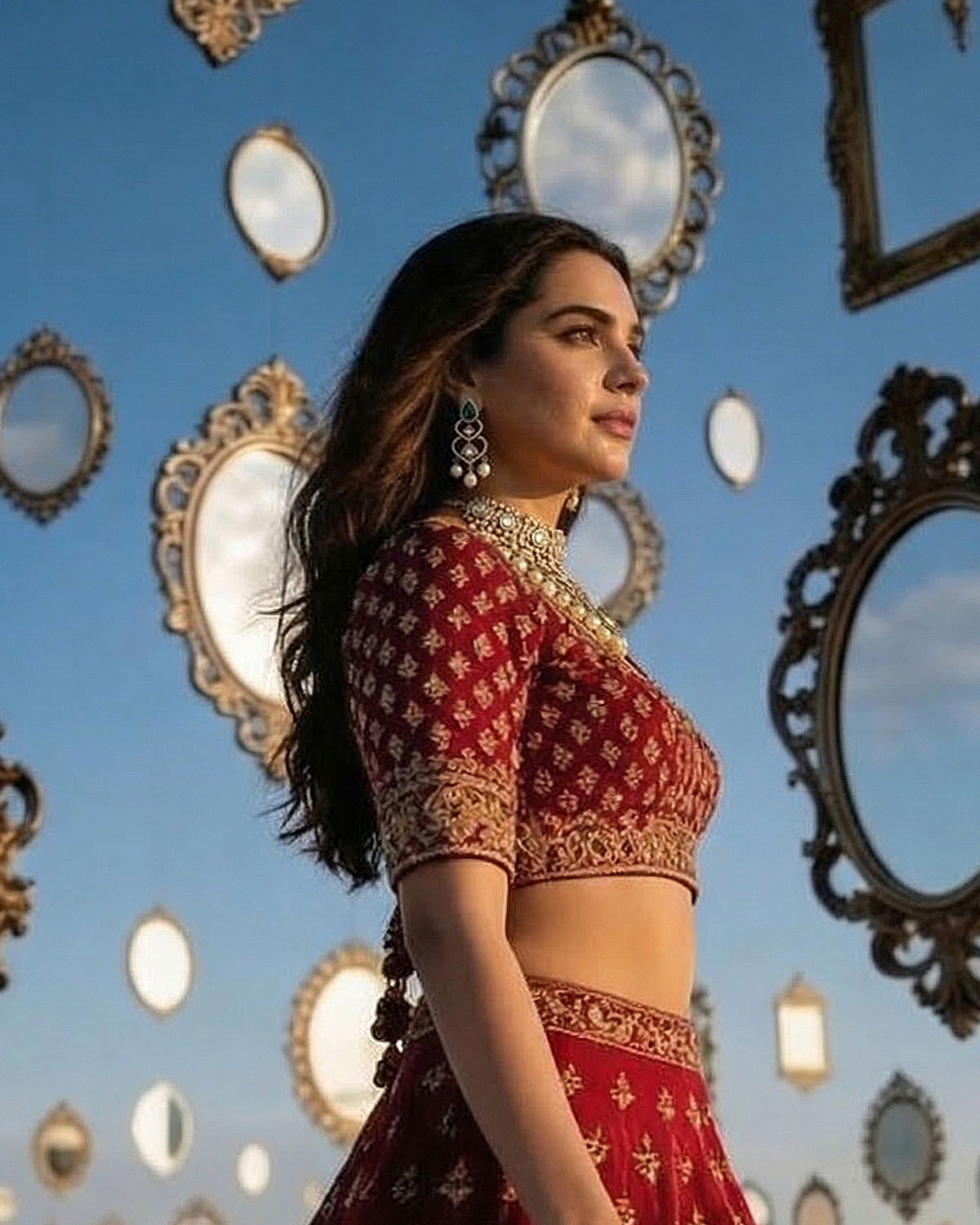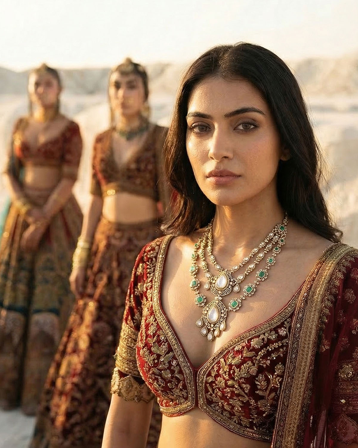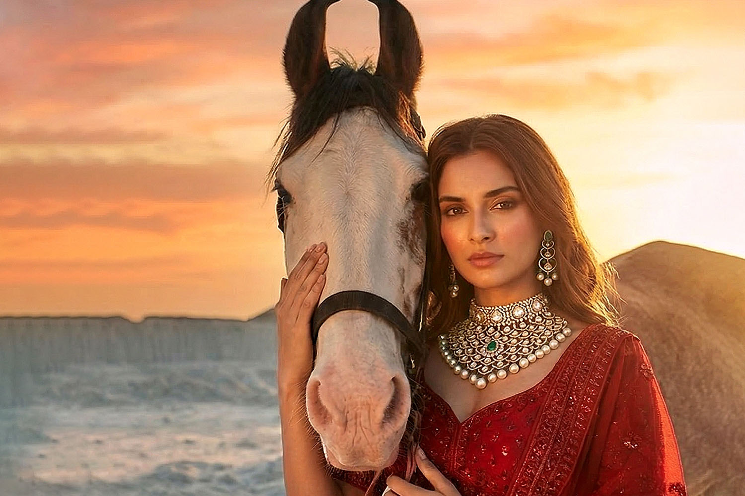 This segment is the most narrative-driven — where heritage and grace converge into a bold visual identity. Set against palatial backdrops and timeless landscapes, the jewellery becomes part of a larger story. Statement bridal sets, layered necklaces, and regal compositions dominate here, designed for full expression. Polki, colored gemstones, and heritage motifs are reinterpreted into modern heirlooms — pieces that don’t just accessorize but define presence. This is the union of Mitti and Meher — where tradition transforms into power, and jewellery becomes a statement of self.