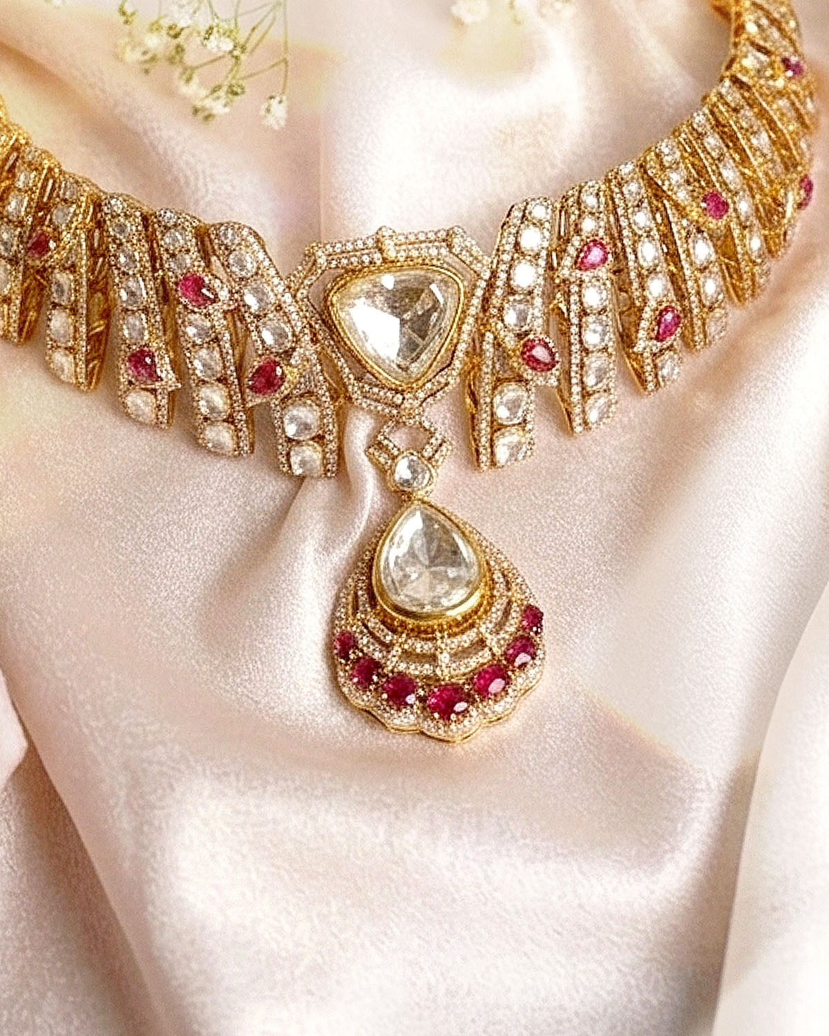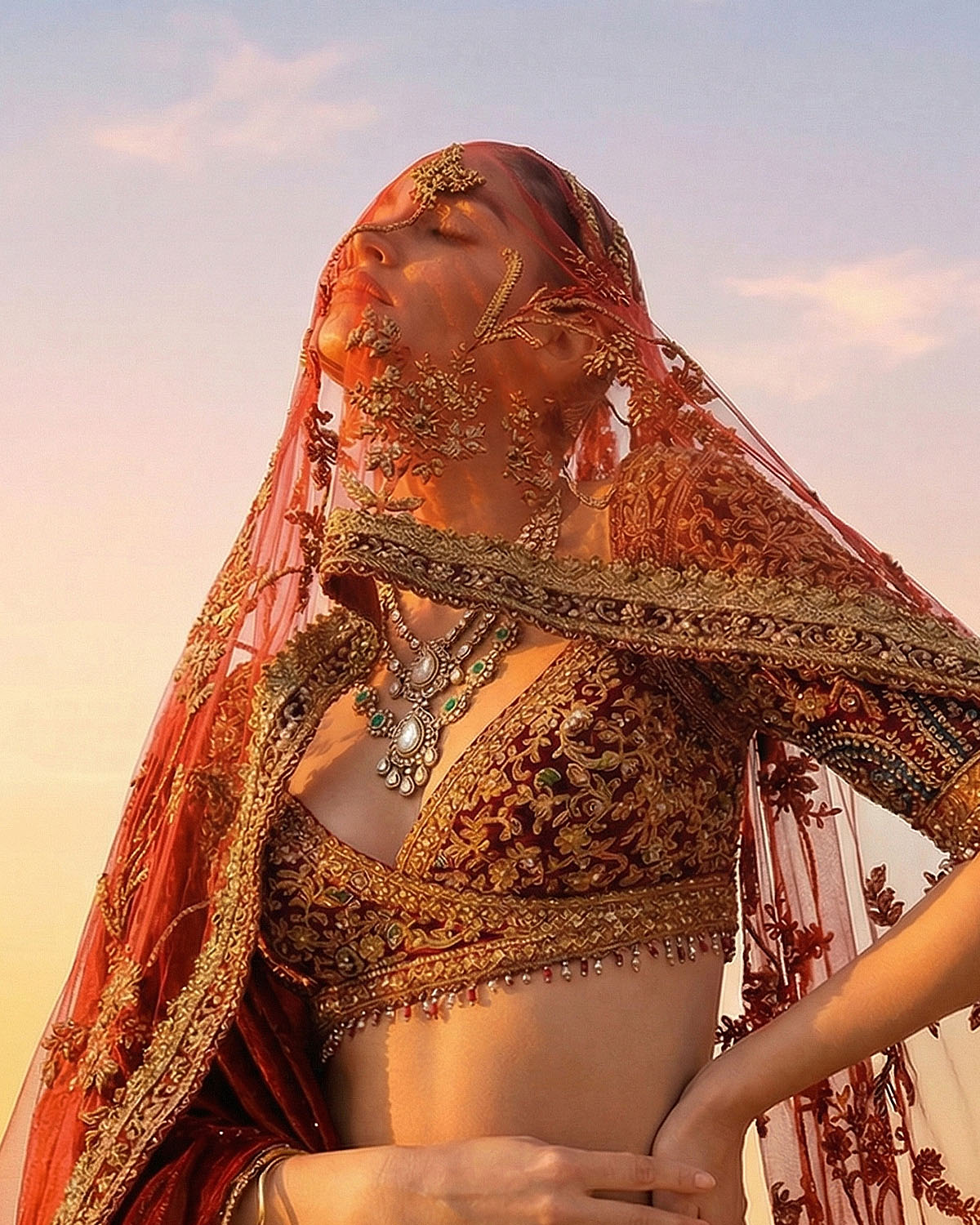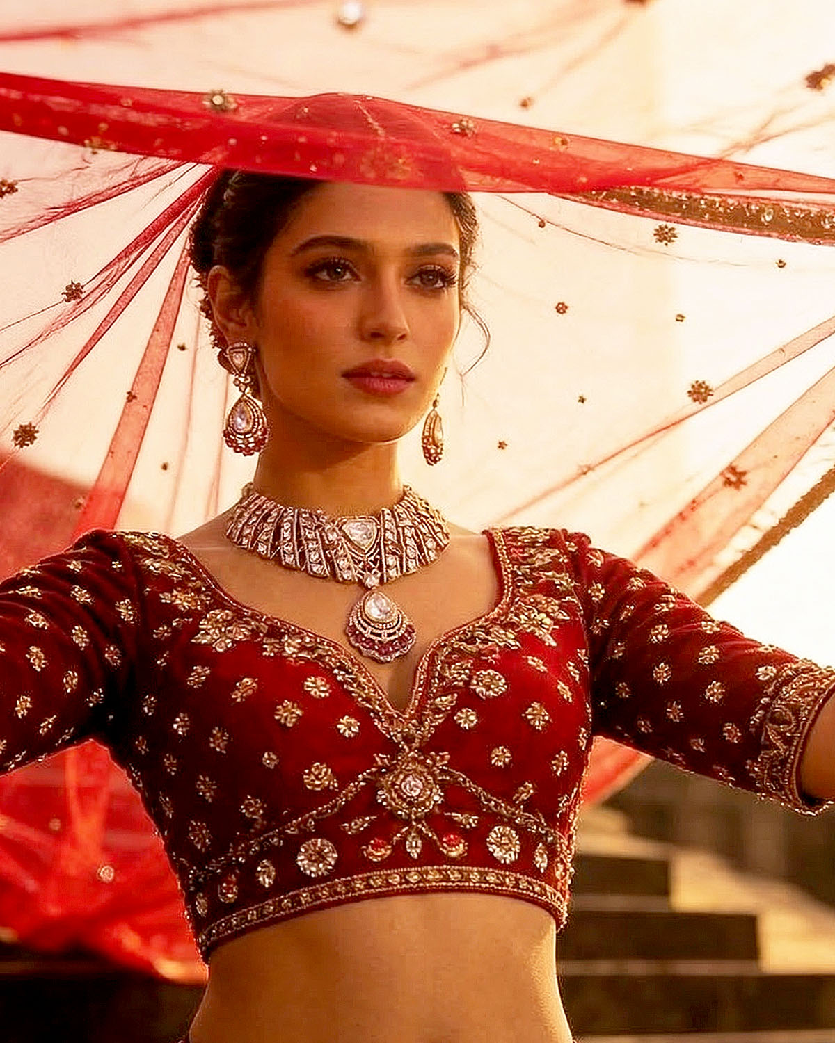 This segment is the most narrative-driven — where heritage and grace converge into a bold visual identity. Set against palatial backdrops and timeless landscapes, the jewellery becomes part of a larger story. Statement bridal sets, layered necklaces, and regal compositions dominate here, designed for full expression. Polki, colored gemstones, and heritage motifs are reinterpreted into modern heirlooms — pieces that don’t just accessorize but define presence. This is the union of Mitti and Meher — where tradition transforms into power, and jewellery becomes a statement of self.