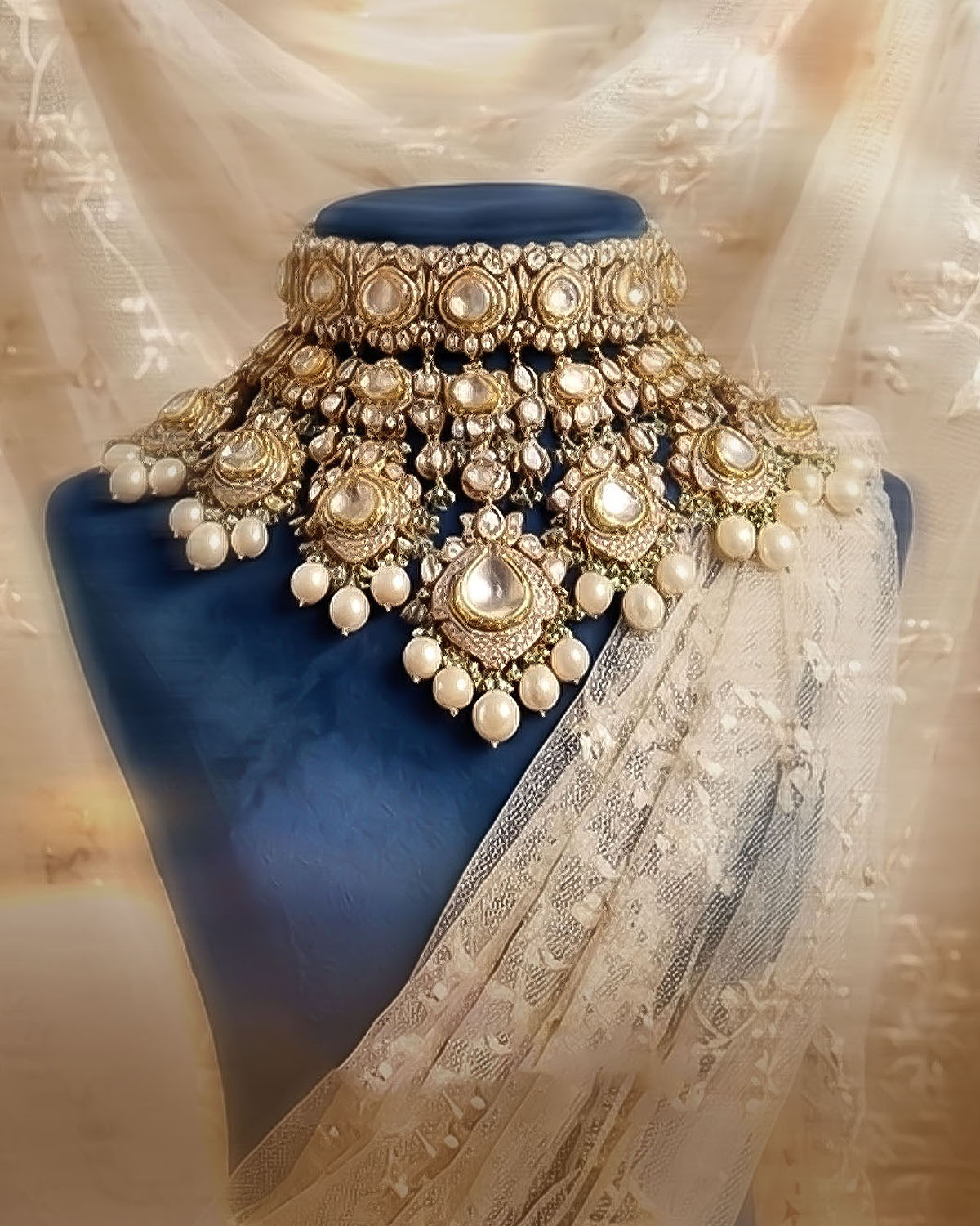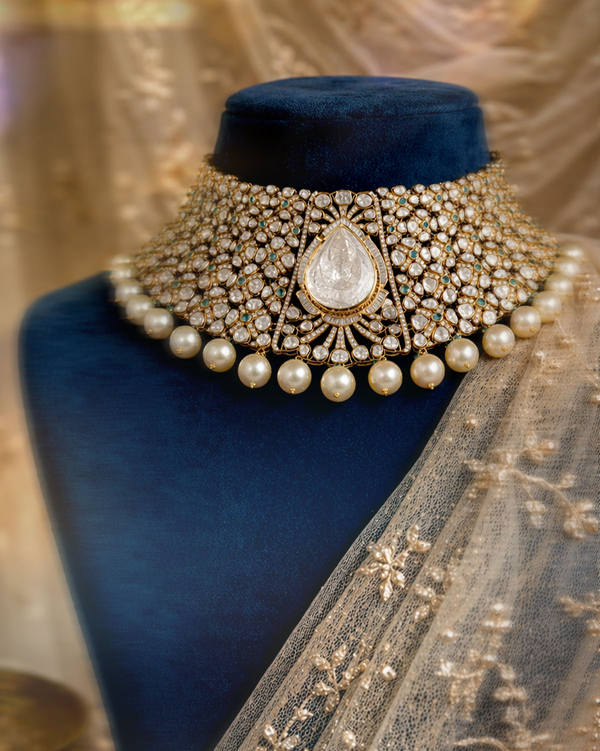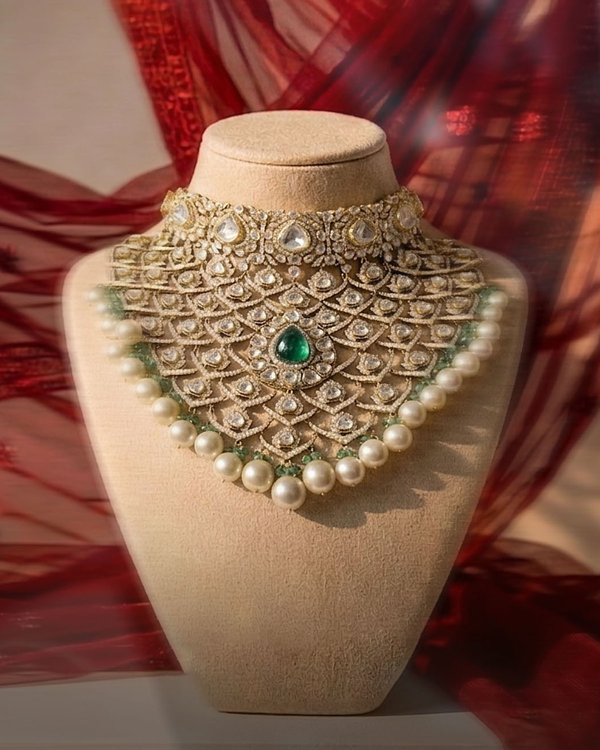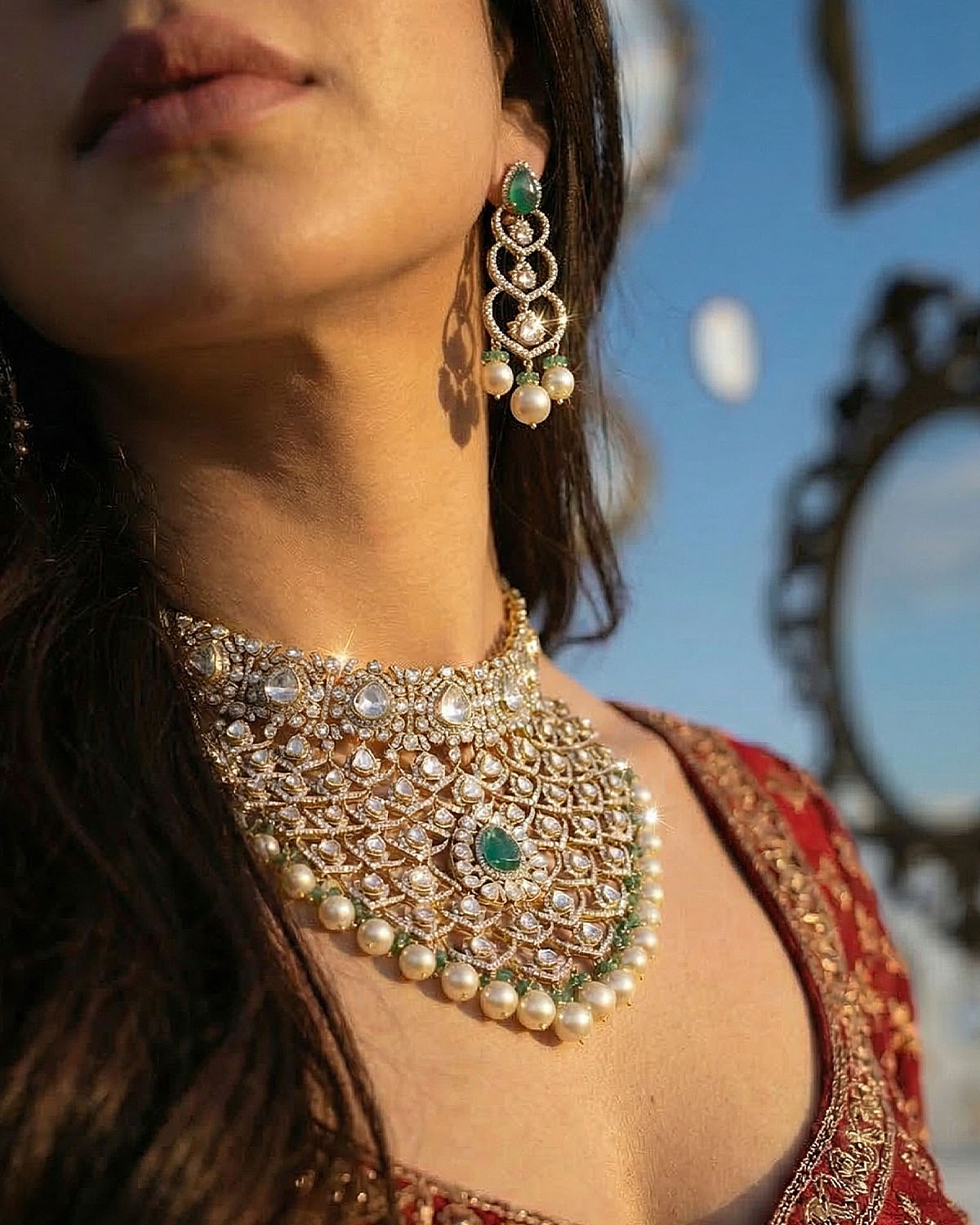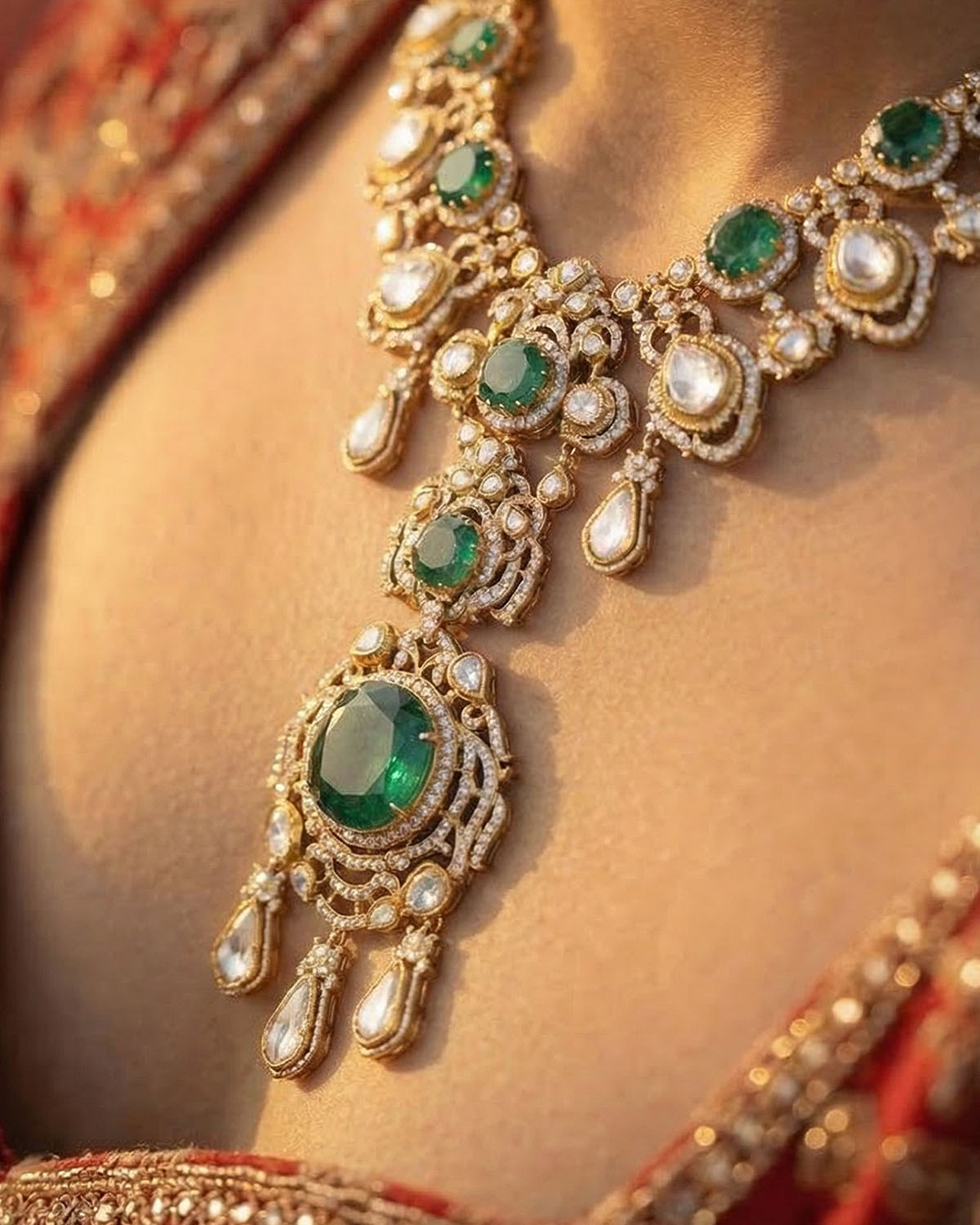 Here, grace begins to reveal itself in intricacy. Expect layered pearl drops, delicate emerald accents, and intricate work that moves fluidly with the body. These designs are softer, more intimate — built for moments that are seen up close. This is where Meher comes alive — not in grandeur, but in refinement. Pieces that transition seamlessly from heirloom to contemporary styling, capturing the poetry of detail.